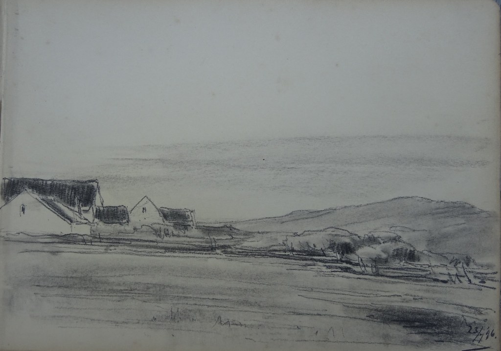Ik denk dat hij achter villa Cassirer in het duin zit en kijkt in de wei van Plug met links De Kroft en rechts de oude Wurft. Dit was vroeger de noordelijke begrenzing van Noordwijk aan Zee. De kerk is dus niet die van Noordwijk Binnen maar de Kapel en mogelijk de Buurtkerk. Ik doe er de volgende tekening bij die het Museum Noordwijk niet zo lang geleden geschonken heeft gekregen en waarin tekeningen van het zeedorp rond 1900 te zien zijn. De richting waarin de tekenaar (Leon Senf?) naar dit beeld heeft gekeken wijkt wel af van de kijkrichting van Liebermann.