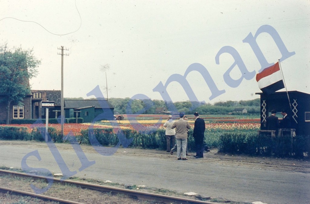 Bloemenverkoop zoals hier kwam je in het voorjaar wel vaker tegen in de Bollenstreek. Hier staan we aan de Herenweg, ongeveer ter hoogte van de tegenwoordige rotonde Herenweg/Beeklaan. Vooral bloemenslingers waren populair: meestal voor op de motorkap van de auto, maar zo te zien ook voor op je hoofd.