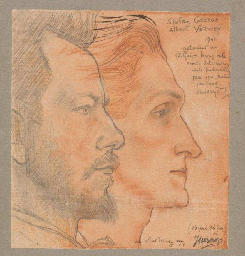 The German writer Stefan George gave a lecture at the First International Exhibition in Boschoord Villa in The Hague on 24 May 1901. He stayed with the poet Albert Verwey in Noordwijk, where this double portrait by Jan Toorop originated. Toorop first made the portrait of George in drypoint and subsequently drew the likeness of Verwey in profile next to him.