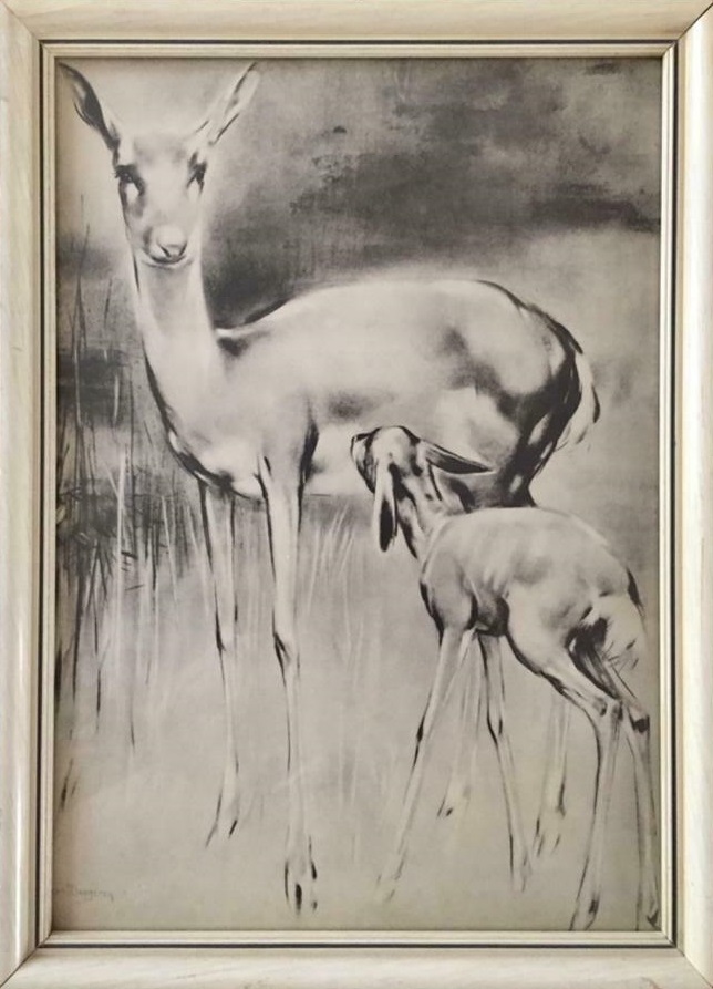 Als kind wist ik verder van niks, maar ik was wel altijd gebiologeerd door een (kopie van een) koperdiepdruk die bij ons thuis boven de kachel hing. En niet alleen bij ons, maar ook bij familie en vrienden thuis. Het moest daarom wel een bijzonder kunstwerk zijn. Het was in zoverre bijzonder dat het hier ging om een van de weinige werken van Van Meegeren, die hij onder eigen naam gepubliceerd had. “Hert met Jong”, heette het en het bleek achteraf in tal van Nederlandse huiskamers te hangen, vaak met dezelfde lijst er omheen en soms in een andere variant als “Hert zonder Jong“: