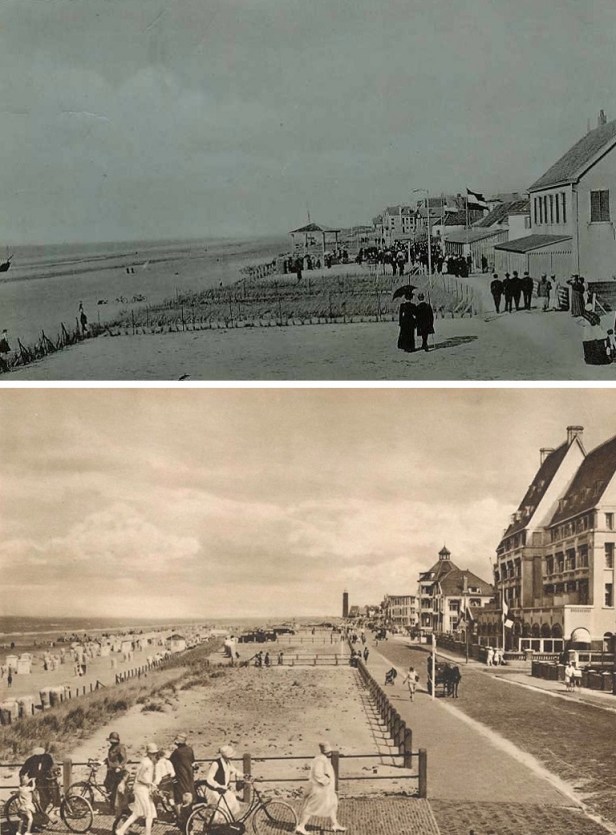 De strandafgang (of ‘opgang’?) is op beide foto’s dezelfde. De omgeving is enigszins veranderd (en nu helemaal). Zoek de verschillen.
