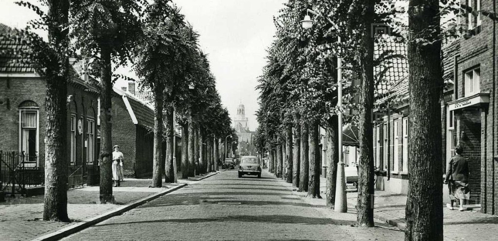 De onvoorstelbaarheid van de foto zit ‘m niet alleen in de aanwezigheid van zoveel bomen op deze plek. Maar de Hoofdstraat kende toen ook nog tweerichtingverkeer. Twéérichtingverkeer!
