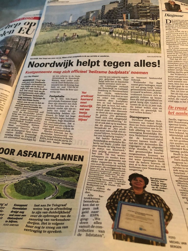 De kop boven het artikel “Noordwijk helpt tegen alles” is schromelijk overdreven en eigenlijk van de zotte, maar dat komen we bij De Telegraaf wel vaker tegen. Het verhaal gaat over de kwalificatie die Noordwijk gekregen heeft van een mij verder onbekende organisatie als zijnde “een heilzame badplaats.” Nou ja, ‘gekregen’: als je het verhaal goed leest blijkt dat er fiks voor betaald is. En dat aanpalende badplaatsen als Katwijk en Zandvoort de prijs alleen maar zijn misgelopen, omdat ze zich niet voor de wedstrijd hadden opgegeven. Tsja.