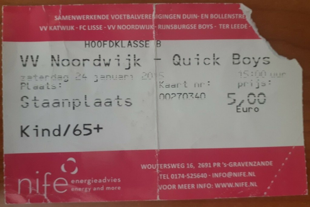 Op marktplaats wordt een kaartje aangeboden voor de wedstrijd Noordwijk-Quick Boys van 24 januari 2015. Een kaartje met kind- of bejaardenkorting. Het kaartje zal wel van een teleurgestelde Noordwijk-supporter zijn geweest, want Noordwijk verloor die (thuis-) wedstrijd met 0-2. Omdat – zoals dat ergens in een verslag werd genoemd – “Noordwijk vergat te voetballen.”