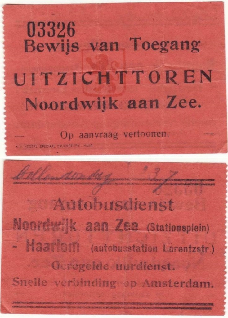 Toegangskaartje voor de ‘uitzichttoren’ in Noordwijk aan Zee. Lees voor ‘uitzichttoren’ maar gerust ‘watertoren’, want die had in ieder geval vóór de oorlog nog een tweeledige functie.