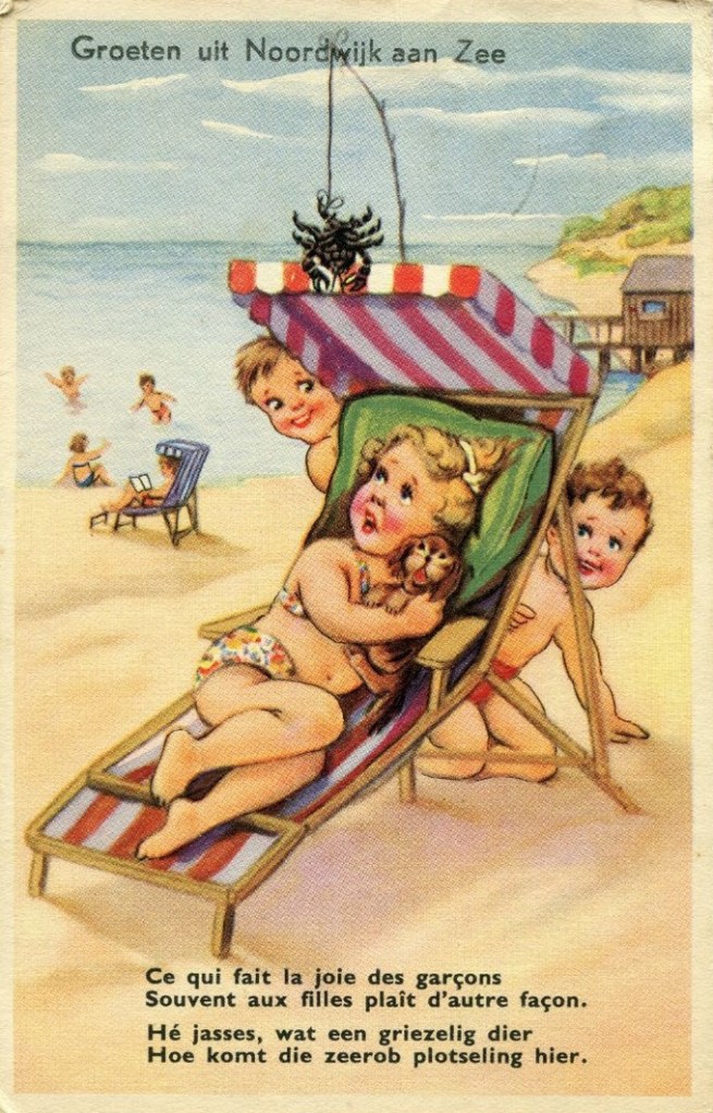 Het is het soort van grappenmakerij dat niet meer van deze tijd is. Maar bij de onderschriften trek ik ook mijn wenkbrauwen op: in het Frans staat er zoveel als “Dat waar jongens lol aan hebben, behaagt het meisjes op een andere manier.” Probeer daar maar wijsheid uit te halen. Maar het wordt nog mysterieuzer als je de Nederlandse tekst leest: die is allereerst geen vertaling van wat er in het Frans staat, maar bovendien kun je vraagtekens stellen bij ‘zeerob’. Er is geen zeerob (‘phoque‘) in de verste omtrekken te bekennen. Wat het arme meisje boven het hoofd hangt is een spin (‘araignée’).