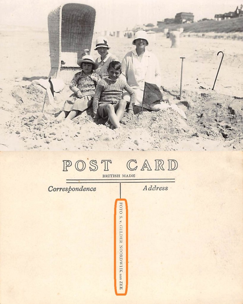 Ik weet dat er vroeger strandfotografen waren zoals Marijt, Admiraal, Braakman ook en Van Kampen. Maar S. van Gelder? Ik was hem al eens eerder tegengekomen. Voor zo ver ik kan nagaan was hij met zijn gezin in 1927 naar Noordwijk gekomen en had hij zich gevestigd als fotograaf aan de Oude Zeeweg nummer 6. Ik vermoed een adres aan de tegenwoordige Grent (want de Oude Zeeweg liep vroeger tot aan het Palaceplein. Maar wie weet meer over deze Van Gelder? En waar aan de Oude Zeeweg precies had hij zijn nering?
