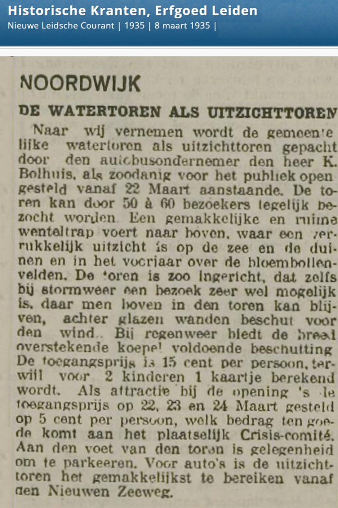 De watertoren kreeg in 1935 een taak erbij: niet alleen zorgdragen voor de watervoorziening in Noordwijk, maar ook zorgdragen voor een mooi uitkijkpunt voor autochtonen en toeristen. Klaas de Bes, die er ook een buslijn op na hield van Noordwijk naar Haarlem v.v. pachtte het geheel en rekende per persoon 15 centen om de toren te beklimmen. De eerste opbrengsten waren echter voor het plaatselijke crisiscomité, want je kreeg voor die prijs dan wel een mooi uitzicht over Noordwijk, maar voor de rest was de sociale en economische situatie van de doorsnee Noordwijker uitzichtloos. Als je boven was, zag de wereld er zo uit: