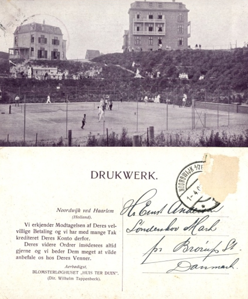 De bloembollenafdeling van Huis ter Duin gebruikte kaarten van de aanpalende hotelafdeling om klanten te benaderen, ook in Denemarken. Als ik het goed heb, betekent ‘blomsterløghuset’ zoveel als ‘bloemenblokhut. Vreemde naam voor een bloembollenbedrijf. In het Duits noemde men zichzelf ‘Blumenzwiebelzüchterei’ en dat klinkt al beter.