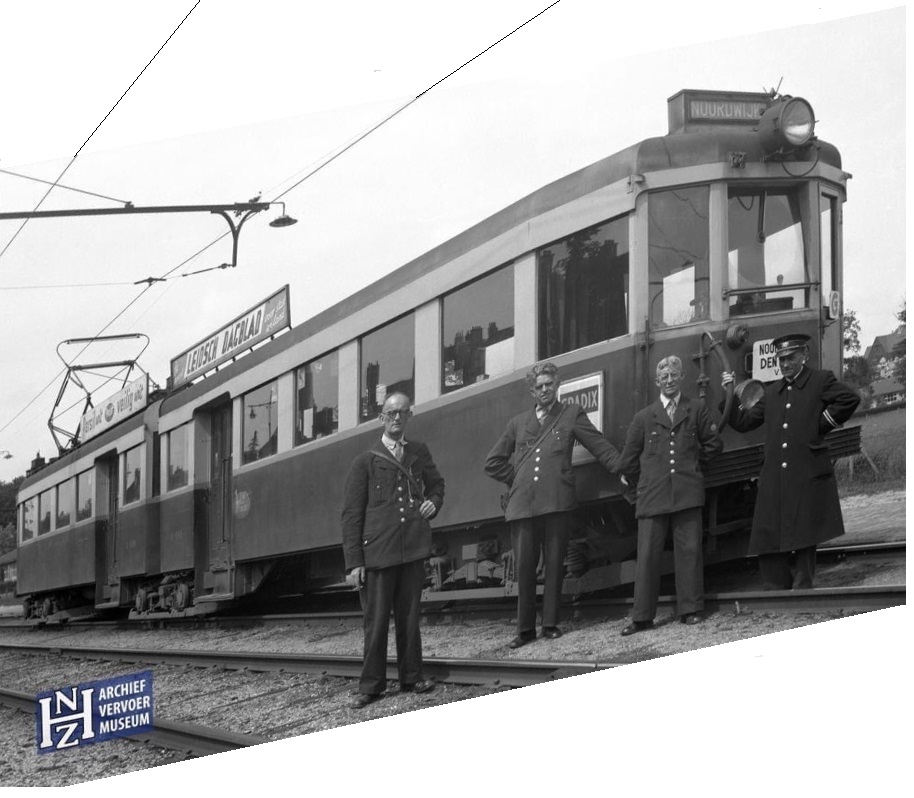 De foto komt uit de verzameling van Hans van Engelen en zit nu ook in de collectie van het NZH Vervoermuseum te Haarlem. De tram van Noordwijk naar Den Haag en vice versa bevindt zich op 27 juni 1954 op het eindpunt op het Malieveld in Den Haag. Op de foto van links naar rechts de conducteurs Dreef en Van der Blom, wagenvoerder Krispijn en controleur Leemans. Of dat allemaal Noordwijkers waren, weet ik niet. De namen komen mij in ieder geval niet bekend voor. De tram wel.