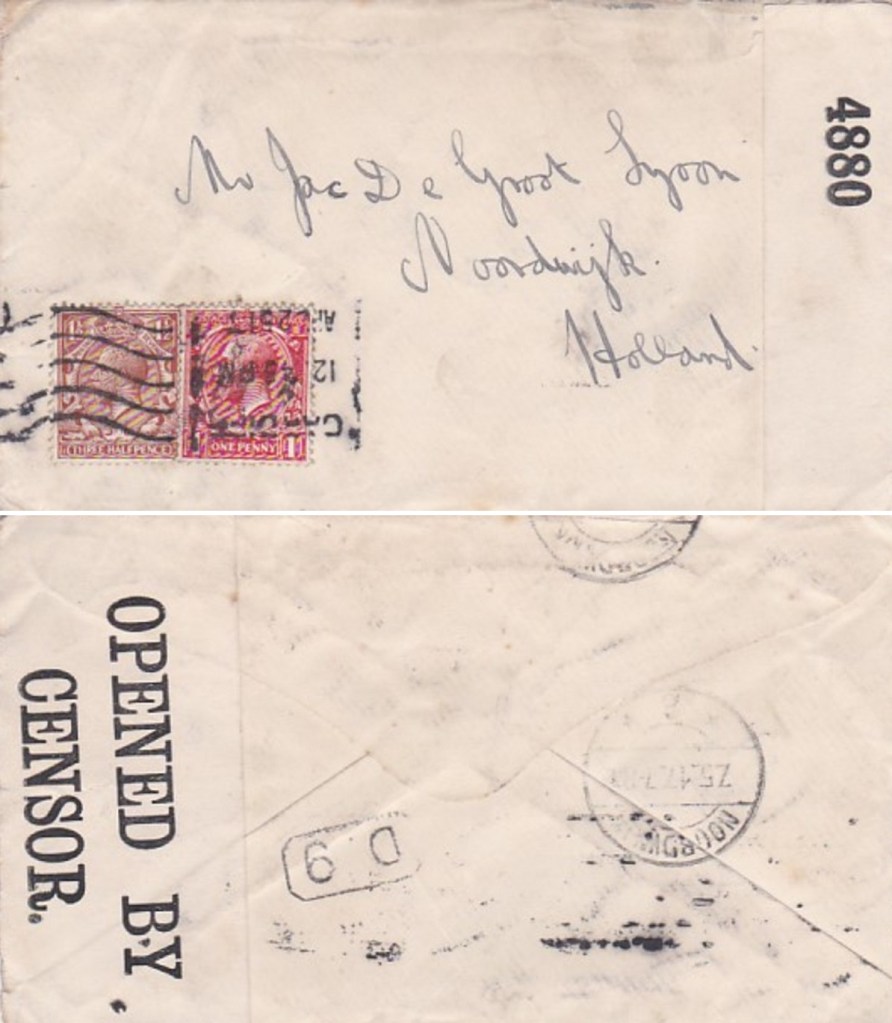 Jac. de Groot in de Douzastraat kreeg op 7 mei 1917 een brief uit Cardiff, maar daar was dan wel de censor over heen gegaan. Het was per slot van rekening nog volop oorlog, buiten Nederland weliswaar, maar toch. De censor had er nogal wat werk van gemaakt blijkbaar, want daar in Cardiff was de brief al op 12 april op de post gedaan. De censor had blijkbaar meer dan 3 weken nodig gehad om de controleren of er nu wel of niet een onvertogen woord in de brief was opgenomen.