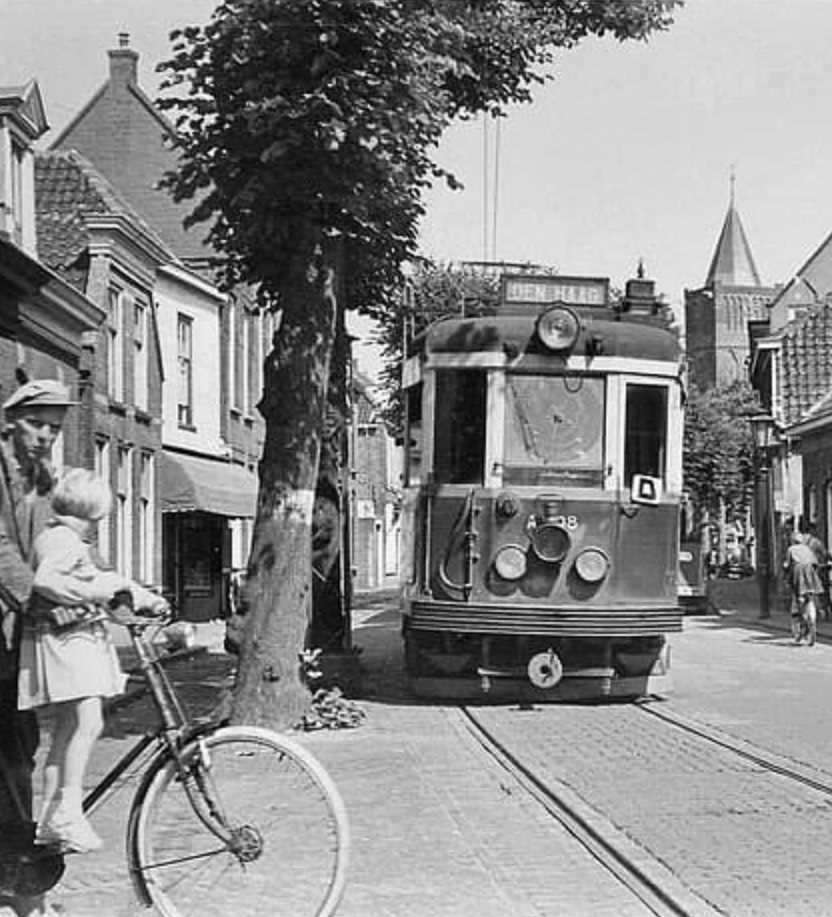 De vader wil met zijn dochtertje op de fiets de Voorstraat oversteken van de Douzastraat naar de Offemweg. Maar hij wacht nog even totdat de tram is gepasseerd en dat is maar goed ook.