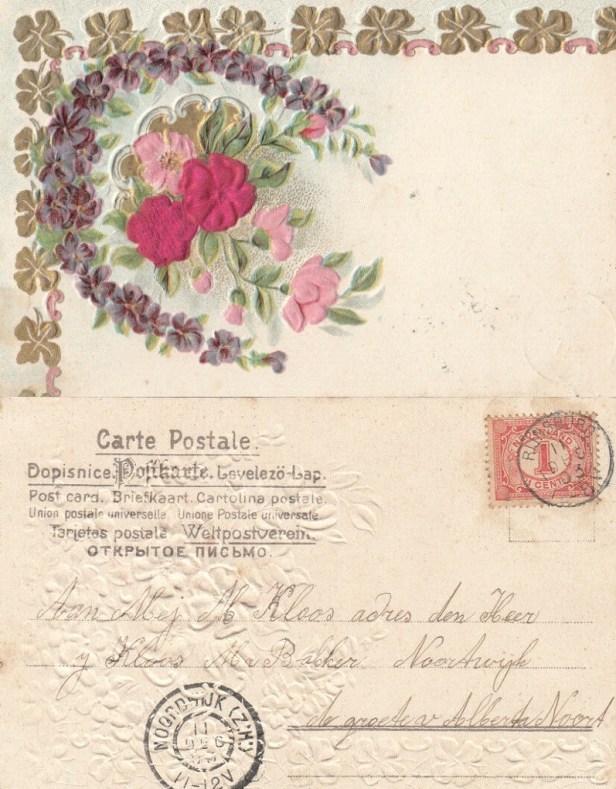 Mejuffrouw Kloos kreeg een liefdevolle kaart van ene Albert Noort uit Rijnsburg (die Noordwijk met een ‘t’ schreef). Per adres haar vader: de late bakker en historicus Jan Kloos (naar wie later nog een mooie prijs zou worden vernoemd 🙂 )