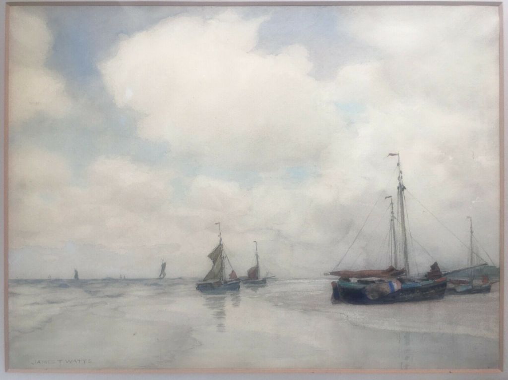 James Thomas Watts (1853-1930) was een Britse schilder, die Liverpool als thuishaven had. Maar af en toe maakte hij wel uitstapjes naar het continent. Zo was hij ook in Noordwijk, waar hij dit schilderij maakte van ‘seascape chalutiers’, vrij vertaald: ‘zeewaardige vissersschepen’. Nog te koop op ebay tot medio december!