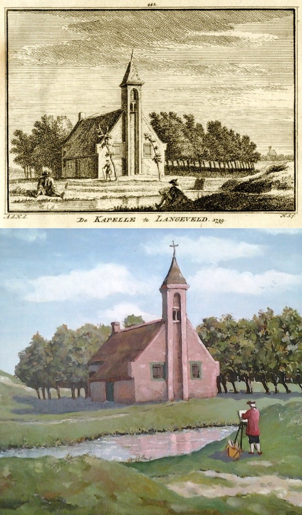 Een kopergravure van Hendrik Spilman uit 1750, naar een tekening van Abraham de Haan uit 1739, van de kapel in het Langeveld. Hendrik van den Hoonaard maakte er aan de hand van deze gravure een schilderij van. Er is ook een boek over de kapel verschenen van de hand van Jan van der Elst Maud Mommers, waaraan ik onderstaande samenvatting ontleen: Vijf eeuwen wist de Langeveldse kapel de tijd te trotseren. Het bijzondere verhaal erachter is een mengelmoes van feiten en fictie. Zoals de legende van de edelman die voor de kust van Noordwijk in een storm terecht kwam. In doodsangst tot de Heilige Maria bad en als dank voor zijn redding deze kapel liet bouwen. Vijf eeuwen (van 1330 tot 1880) wist de kapel de tijd te trotseren. Wat er nu nog van rest zijn enkele gedenkstenen, die naast de Maria ter Zee kerk aan de Nieuwe Zeeweg zijn geplaatst.