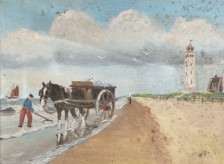 Schilderij van een onbekende meester. Te koop op marktplaats. Een ‘schulper’ op het Noordwijkse strand. Het schilderij vertoont ernstige vlekken. Daar moet eerst nog overheen worden gegaan met borstel en groene zeep 😦
