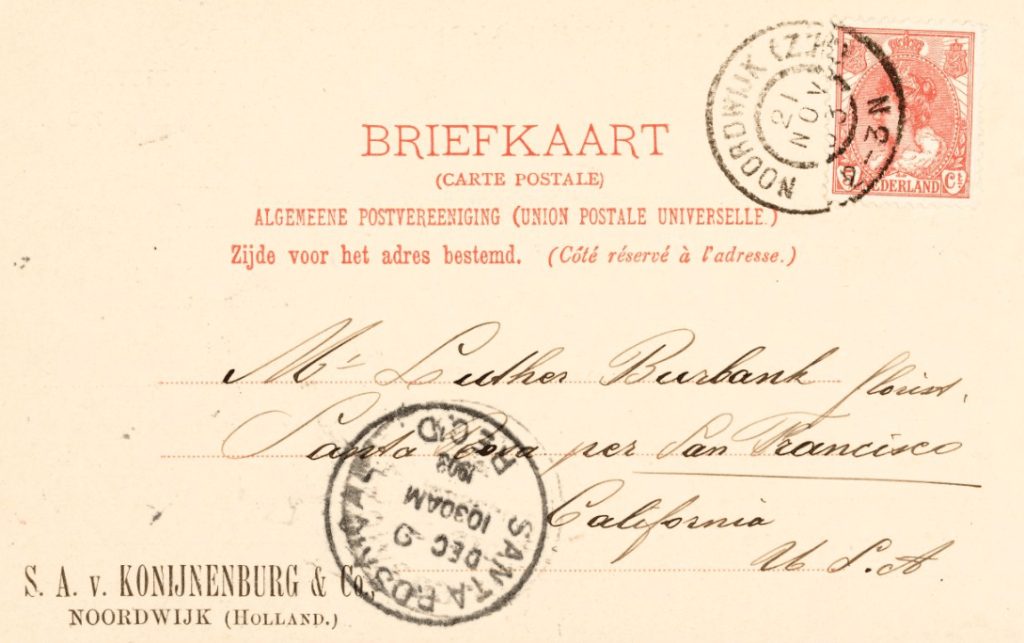 Briefkaart van S.A. van Konijnenburg aan Luther Burbank in Santa Rosa, California. “Siem Knijn” vroeg met deze kaart een prijslijst aan van nieuwe soorten bloemgewassen en bij Burbank was hij aan het goede adres. Want Luther Burbank was een wereldberoemde botanist. De Wikipedia heeft een uitgebreid artikel over de man, waarvan de aanhef als volgt luidt: “Luther Burbank (March 7, 1849 – April 11, 1926) was an American botanist, horticulturist and pioneer in agricultural science. He developed more than 800 strains and varieties of plants over his 55-year career. Burbank’s varied creations included fruits, flowers, grains, grasses, and vegetables. He developed (but did not create) a spineless cactus (useful for cattle-feed) and the plumcot.”