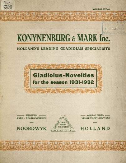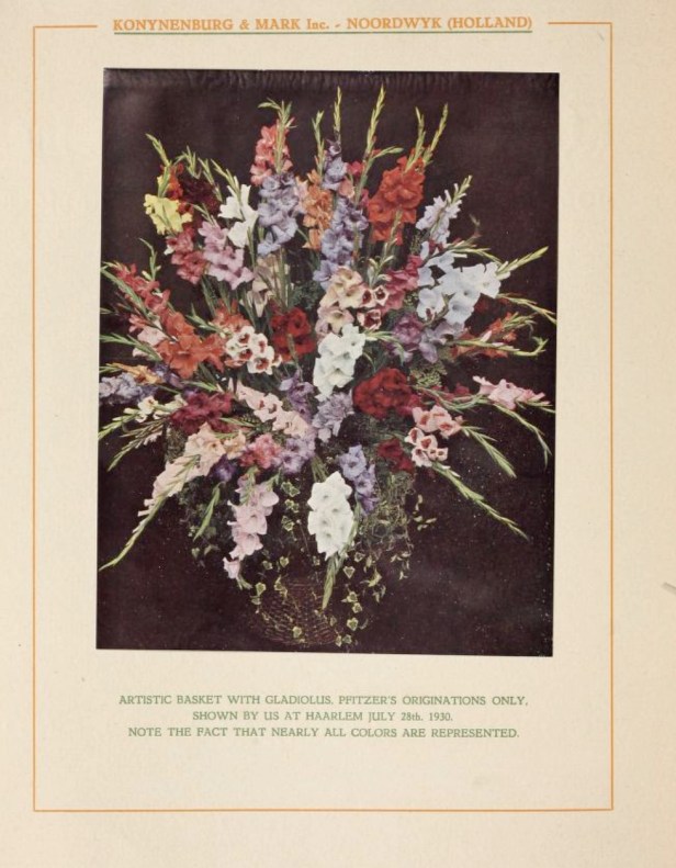 De firma Konijnenburg & Mark gaf voor het seizoen 1931/1932 een internationale gladiolencatalogus uit voor haar buitenlandse klanten. Om die lekker te maken voor mooie Noordwijkse producten, werden in die catalogus ook kleurenfoto’s afgedrukt. Zoals deze: