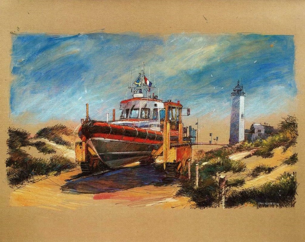 De reddingsboot is de Valentijn uit Noordwijk. De kaart is te koop op marktplaats. Het beeld is van kunstenaar Paul Kerrebijn.