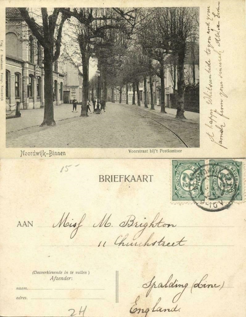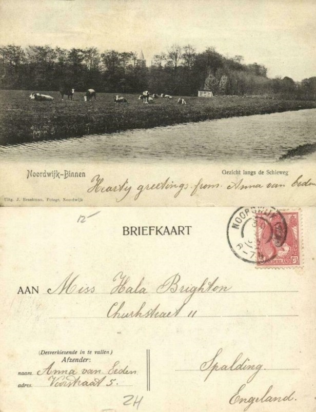 Anna van Eeden had blijkbaar een goede vriendin of kennis in Spalding / Engeland wonen, want ze stuurde haar twee mooie kaarten van Noordwijk Binnen. Een kaartje van de Schiestraat met een weilandje dat inmiddels – volgens mij – door bomen en planten overwoekerd is. En een kaartje van nabij het postkantoor aan de Voorstraat.