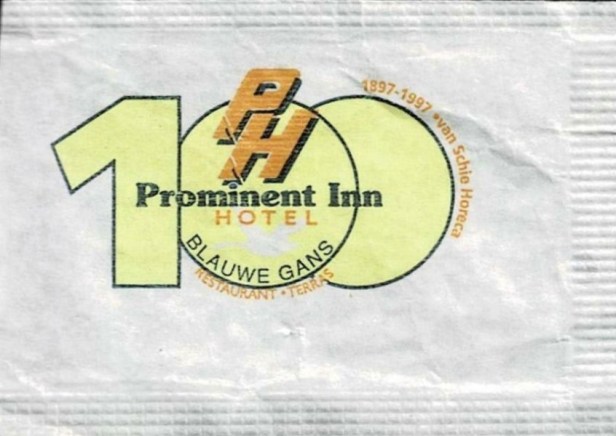 Het suikerzakje van Prominent Inn/ De Blauwe gans vermeldt nogal ostentatief het getal ‘100’. Het suggereert dat beide etablissementen al 100 jaar bestaan, maar dat kan niet zo wezen. Het café van de Weduwe Van Schie dat hier ooit stond zou wel 100 jaar hebben kunnen bestaan, ware het niet dat het ten onder is gegaan in een aanslag van modernisering.