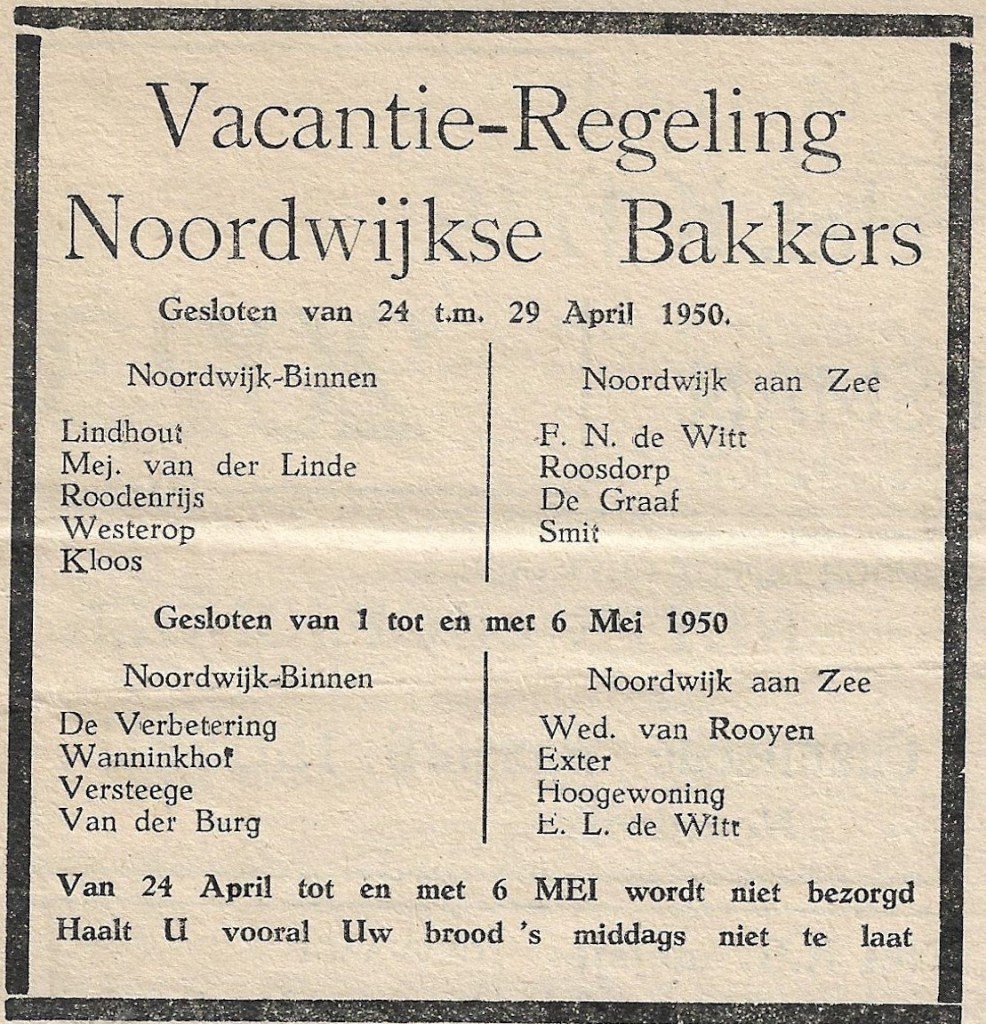 In 1950 waren er nog 17 bakkers in Noordwijk en er werd nog brood bezorgd ook. behalve dan van 24 april tot en met 6 mei, want in het bakkerswezen ging men al vroeg op vakantie.