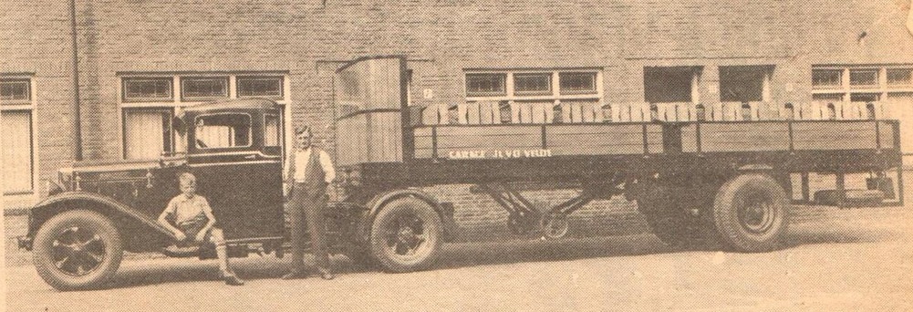 Broekhuyzen BV was een in Noordwijk bekende aardappelenhandel, die zich in de Jaren Zestig meer en meer ging toeleggen op het voorbakken en leveren van patat frites. De firma werd in 1918 opgericht en was jarenlang gevestigd aan de Herenweg 301 in Noordwijk, in het gebied dat bekend staat als “De Klei” te Noordwijk. Inmiddels is het bedrijf gevestigd in Noordwijkerhout, maar niet dan nadat de bollengronden in Noordwijk door de aardappelteelt dreigden te worden uitgeput (Broekhuyzen teelde aanvankelijk de aardappelen zelf). Inmiddels is het bedrijf ook omgetoverd van productiebedrijf naar groothandel. Op bovenstaande foto betreft een van de eerste trucks met oplegger, waarmee de aardappelen van heinde en verre (men ging later de aardappelen betrekken uit Noord Holland) werden aangevoerd naar “De Klei”. Voor een meer volledige geschiedenis van het bedrijf: klik hier.