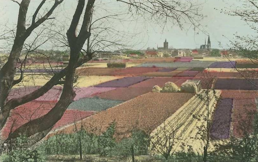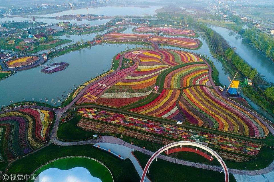 De bloembollenvelden bij Noordwijk lagen er doorgaans bij zoals op bovenstaande foto. In China heeft men andere ideeën over de aanleg van een gemiddeld bloembollenveld. Zie foto onder:
