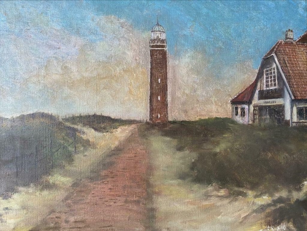 Schilderij van de vuurtoren, ergens vóór WOII. Gemaakt door visboer annex amateurschilder Dirk Bedijn. Te koop op marktplaats.