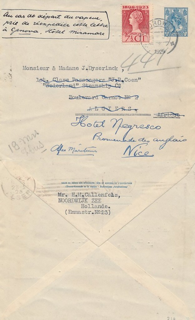 Men deed erg zijn best om deze brief uit Noordwijk ter bestemde plekke te krijgen. Of het gelukt is, is onzeker. Oorspronkelijk ging die naar de heer en mevrouw Dyserinck, als eerste klasse passagiers aan boord van de “J.P. Coen”, die verondersteld werd in Algiers aan te meren. Er was met de hand bijgeschreven dat als dit stoomschip onverhoeds al vertrokken was, de brief dan door te sturen naar Hotel Miramare in Genua. Maar ook daar ging het blijkbaar mis, want de brief werd doorgestuurd naar Hotel Negresco, blijkbaar in de veronderstelling dat de schuit daar nog eerder (of later) zou arriveren.