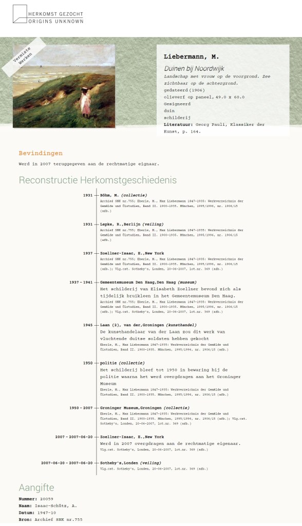 Dat Max Liebermann zo’n schilderij als dit maakte – waarschijnlijk gezeten voor het huis van Paul Cassirer (het latere Casa Mare) – is één ding. Een tweede is de lange reis die zo’n schilderij dan vervolgens gaat maken. Het raakte eventjes zoek na de oorlog, maar kwam uiteindelijk toch terecht bij de wettige erfgenamen van de oorspronkelijke eigenaar (die het vervolgens prompt te gelde maakten).