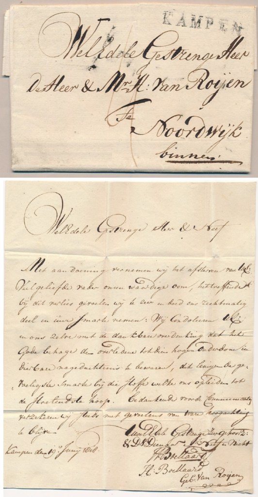 Bij gaande brief was afkomstig van zijn nichtje Henriëtte Boellaard-Van Roijen uit Kampen. Zij was de dochter van Hendrik van Roijen, een broer van Abraham. Negen dagen na de dood van haar oom, schreef ze de brief met rouwbeklag aan een zoon van Abraham, een volle neef. De brief was geadresseerd aan het sterfhuis in Noordwijk Binnen, want de oude Abraham was na zijn religieuze en zalvende praktijken in Noordwijk aan Zee met emeritaat gegaan en had de kuierlatten naar Noordwijk Binnen genomen. Daar had hij zijn intrek genomen in Huize “Zylrust” aan de tegenwoordige (oude) Offemweg. Hij werd begraven in de oude Jeroenskerk.