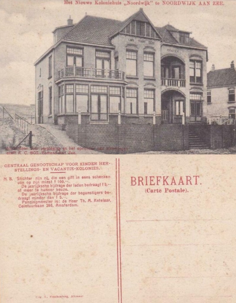 Het Centraal Genootschap voor Kinderen Herstellings- en Vacantie Kolonies: we hebben het er al eerder over gehad. Ook over dat koloniehuis aan de Oude Zeeweg, hierboven op de foto. Bijzonder aan déze oto is dat die blijkbaar genomen is kort na de overname van het pand door het Genootschap: want van enige aanduiding van ‘koloniehuis’ op de gevel is nog geen sprake (zoals later wel het geval zou zijn). Nu prijkt er op de gevel nog “Lawn Tennis- Zicht”. Er staat meer naar rechts ook nog iets anders op de gevel, maar dat kan ik niet lezen.