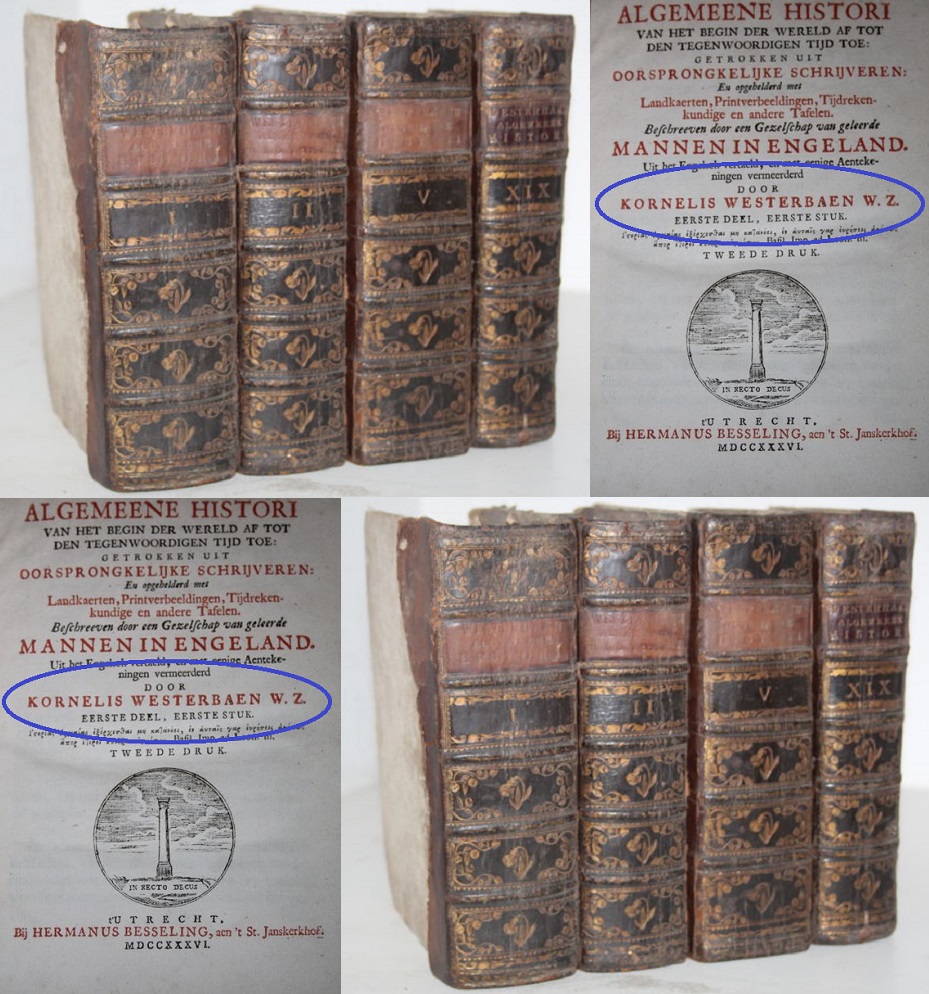 De geschiedenis van de wereld in 18 delen. Hierboven staan er nog maar een paar van afgebeeld. De serie is oorspronkelijk geschreven door de Engelse geleerden Archibald Bower, John Campbell, George Psalmanazar, George Sale, George Shelvocke, John Swinton en anderen. Voor de Nederlandse versie nam Kornelis Westerbaen deze taak op zich.