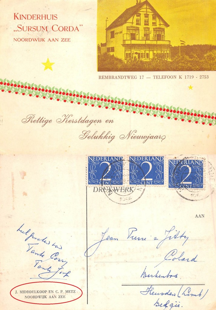 Het is niet de tijd voor Kerst- annex Nieuwjaarswensen. Maar toch. Ik kom deze kaart tegen van kinderpension “Sursum Corda”, gerund door de dames Joop Middelkoop en Corry Metz. Het was een kinderverblijf (krantenberichten uit die tijd stellen dat er geen volwassenen mochten komen). Dat was allemaal in de Jaren Vijftig. Maar een decennium later zijn beide dames nog steeds actief, zij het dat zij hun kinderverblijf dan hebben verplaatst naar verderop aan de Rembrandtweg, naar het zgn. Hans Brinkerhuis. En Joop Midddelkoop (sic!) gebruikte in haar naam één ‘d’ te veel, maar dat zij heur vergeven.