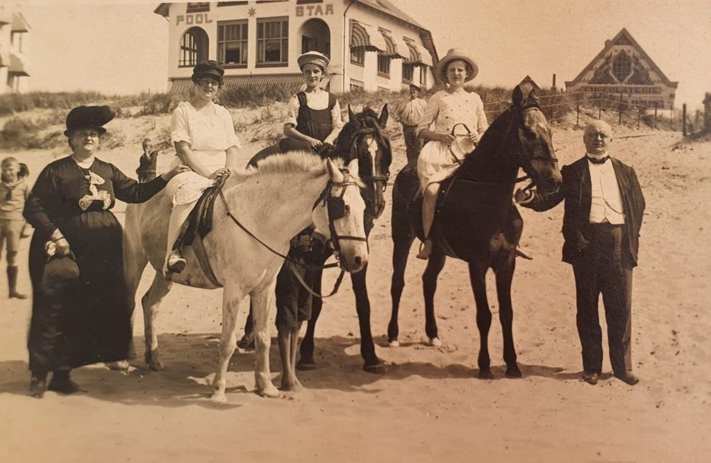 Op facebook verschijnt bovenstaande – schitterende – foto, die wat mij betreft vooral een nieuw licht werpt op het gebouwtje daar rechts. Hier heet het volgens het bord aan de gevel een ‘Chocolaterie’ te wezen. Maar er zijn afbeeldingen, waarop een geheel andere benaming aan het pand plakt: Eerst was het ‘Restaurant Lunchroom Tivoli’, later was het ‘Lunchroom De Landbouw’. Het gebouwtje heeft de tand des tijds niet overleeft. Het werd vervangen door een versteend gebouw, waar jarenlang ‘De Landbouw’ was ondergebracht, zoals ik die kende. Maar intussen is dat bouwwerk ook al weer ondergespit in de rulle duinzanden.