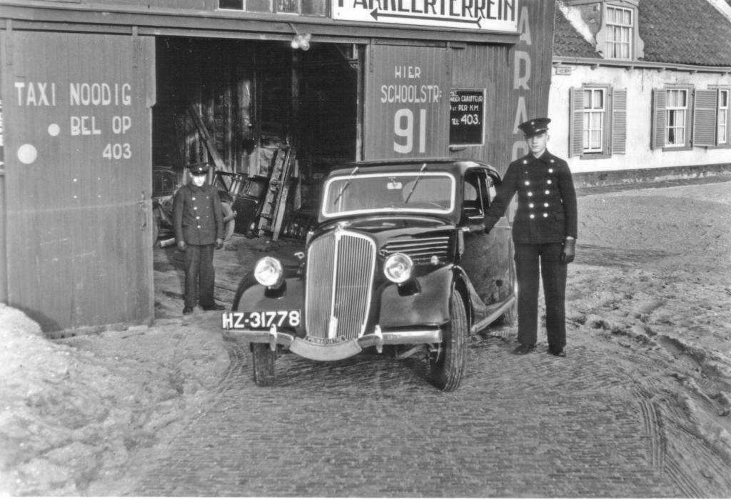 Ron komt op JBEEN met deze prachtige foto van een taxibedrijf aan de Schoolstraat (“Oude Werf”?). De auto is een Renault Primaquatre, Type ACL1 uit 1936 en maakte deel uit van een serie van 3. De eerste Renault Primaquatre werd gebouwd in Haaren-Vilvoorde in België tussen 1931 en 1941 en was de opvolger van de Renault KZ. Deze generatie van de Primaquatre werd voor het eerst tentoongesteld op 29 december 1930 als Type KZ6, die een doorontwikkeling was van de eerdere KZ-serie. Het model had een viercilinder 2120 cc motor die 35 PK leverde wat zorgde voor een topsnelheid van 100 km/u. In januari 1936 kwam deze nieuwe Primaquatre (Type ACL1) op de markt met een nieuwe en krachtigere 2383 cc motor die 48 PK leverde. In de volgende jaren kwamen er een aantal varianten uit: de acl2, BDF1, BDF2 en BDS1 tot in de vroege zomer van 1940 toen de onverwachte snelheid van de Duitse invasie een einde maakte aan de productie van de meeste personenwagens in Frankrijk. De laatste Primaquatre was de Primaquatre Sport (Type BDS2) met de 2,4 liter motor die 56 PK leverde. Het type BDF2 had een motor die zelfs 62 PK leverde. Een laatste technische verbetering kwam in 1940 toen Lockheed hydraulische remmen leverde die de kabelremmen vervingen. Wikipedia wijdt een speciaal lemma aan deze auto:
