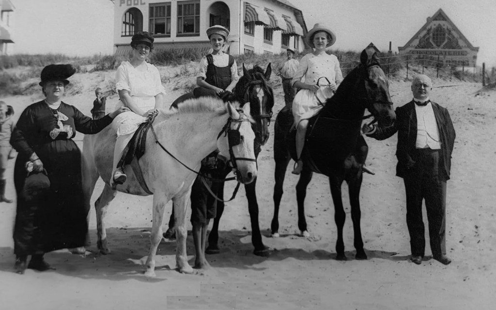 Fraai gezelschap mensen en peerden. Verschijnt op JBEEN. Op de achtergrond Poolstar en een ‘chocolaterie’, een tent waar later café-restaurant De Landbouw zijn oorsprong zou vinden.