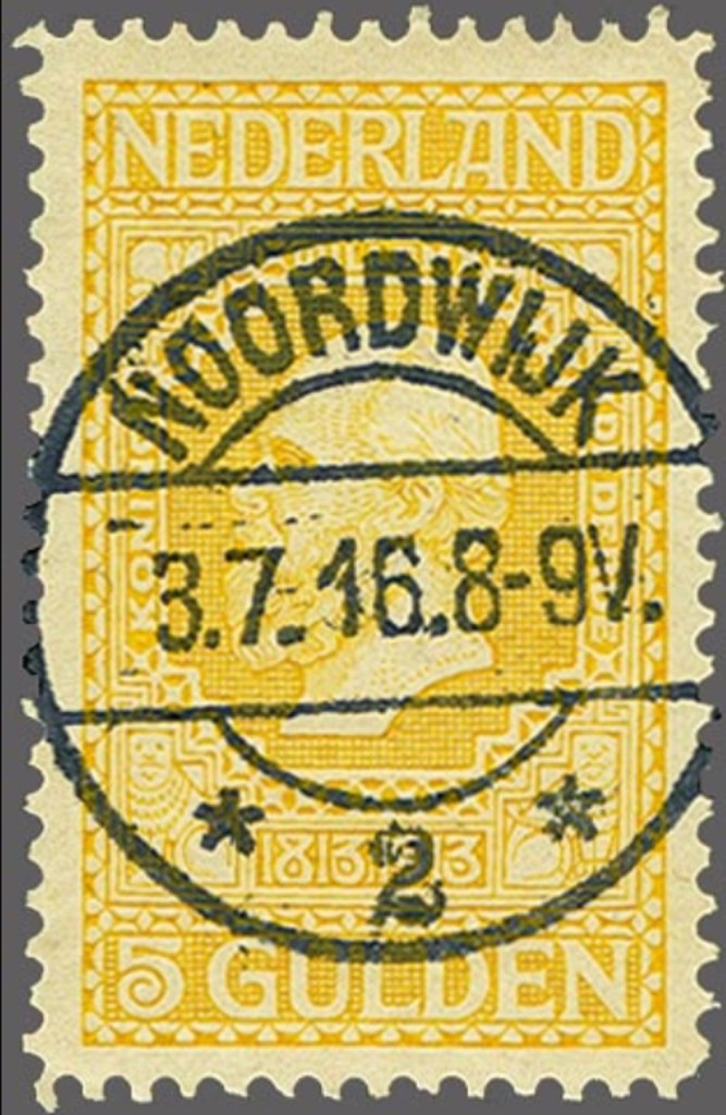 De postzegel werd stevig, maar precies afgestempeld vandaag precies 105 jaar geleden, des morgens tussen 8 en 9 uur. De postzegel is een ontwerp van architect en vormgever K.P.C. de Bazel (die nog een bestaand villaatje op zijn naam heeft staan in Noordwijk) en werd uitgegeven op29 november 1913 ter gelegenheid van Nederlands herstelde onafhankelijkheid. In een catalogus van 19 jaar geleden ‘deed’ deze gelopen zegel nog altijd een mooie 50 euro.