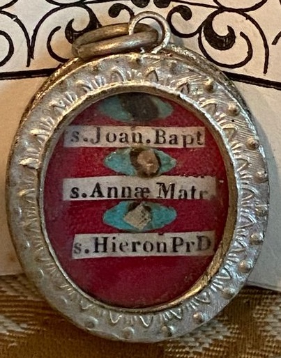 Op Catawiki wordt dit drievoudig relikwie aangeboden uit 1866, geautoriseerd en al door Zijn Heiligheid de Paus Himself. Het betreft relicten uit de omgeving van (bien etonné de se trouver ensemble!) Johannes de Doper, de Heilige Anna (moeder van de Heilige Maagd Maria) en de Heilige Jeroen uit Noordwijk.
