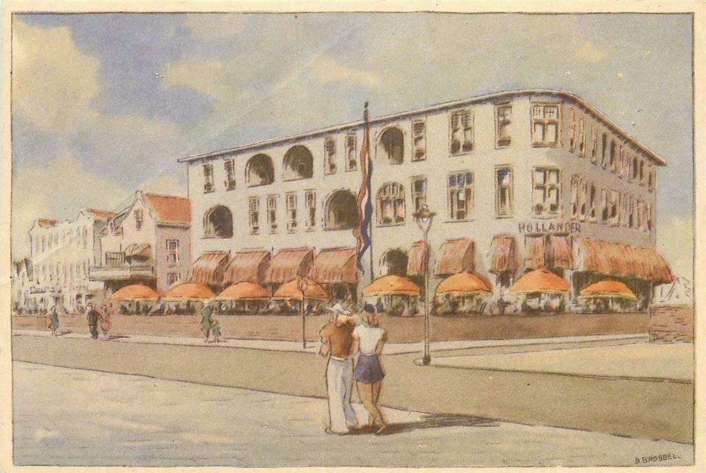 ‘Noordwijkse’ aquarellen van Bob Brobbel zijn hier al eens vaker langsgekomen. Deze – van het voormalige Hotel Hollander – mag niet ontbreken.