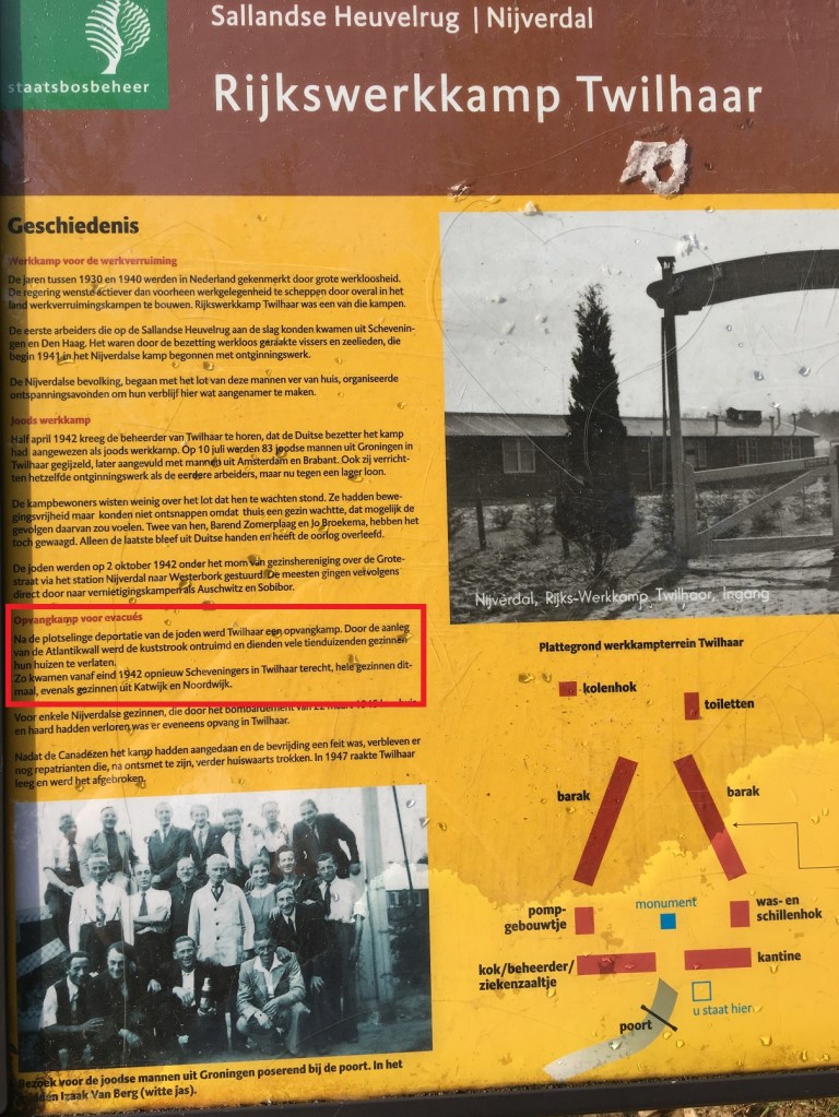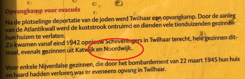 Tussen 1943 en 1945 huisvestte kamp Twilhaar grote gezinnen die door de Duitsers in het kader van de bouw van de Atlantikwall uit hun huis in de kuststreek verdreven waren. Daaronder wederom Scheveningers en Katwijkers, maar dit maal ook volgens het informatiebord Noordwijkse gezinnen. Op verschillende sites worden de namen genoemd van enkele Scheveningse en Katwijkse gezinnen, maar niet van Noordwijkse. Helaas. Zij mochten in ieder geval na de oorlog allemaal terugkeren naar huis en haard.