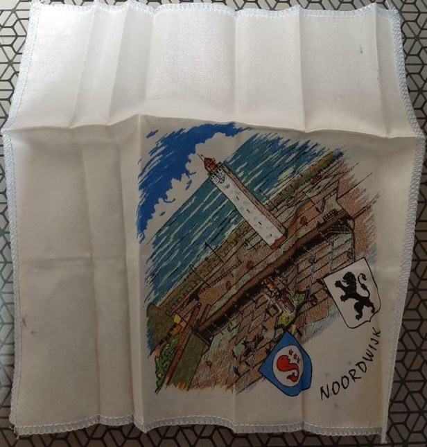 Er zijn vele souvenirs van Noordwijk te vinden in de toeristenwinkels all over the place. Maar deze – een heuse zakdoek – is een curieuze. Je kunt je neus tegenwoordig ophalen voor het Vuurtorenplein, maar ‘m erin snuiten…..?