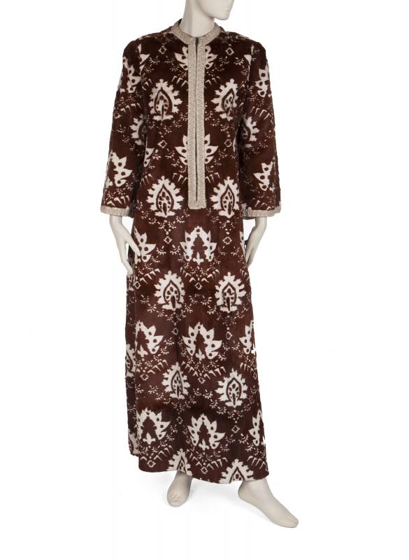 In 2019 kwam dit kledingstuk op een veiling: “A caftan made of chinchilla fur with a brown and beige Eastern’ print, round neck, trimmed in textured beige ribbon, zip up front closure, lined in dark brown silk, label reads “Chombert / Paris.” Het ding ging voor $ 1152 weg.