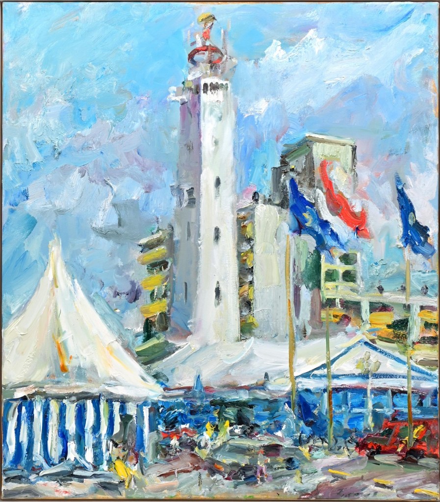 Bij Kunstauktionshaus Günther in Dresden wordt dit schilderij aangeboden van Jürgen Leippert uit 1999: “Der Leuchtturm von Noordwijk”. Al met al een kleurrijk en ook vrolijk stemmend schilderij (misschien ook wel omdat de achtergrond redelijk is geabstraheerd). Begin bod: 200 euro. Bieden kan via invaluable.