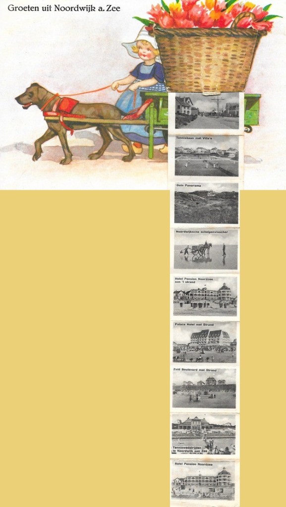 Zo n uitvouwbare ding als dit heet een leporellokaart. In dit geval een mooie combinatie van tulpen uit Noordwijk Binnen en foto’s uit Noordwijk Zee.