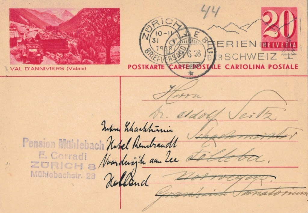 De kaart met een afbeelding van Val d´Anniviers werd zo´n dikke 200 kilometer verder, vanuit Zürich verstuurd. Hij ging naar Dr. Jakob Adolf Seitz in Follebu in Noorwegen. Maar Seitz kreeg de kaart nagezonden, want hij was al vertrokken naar Noordwijk, naar het – befaamde – schaaktoernooi dat daar in het Rembrandt Hotel gehouden werd. Niet dat Seitz daaraan meedeed, maar hij was wel schaakgrootmeester en schaakjournalist en hij deed vanuit Noordwijk verslag van het toernooi voor tal van internationale kranten. Het toernooi zelf is hier wel eens vaker voorbij gekomen.