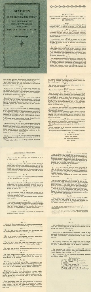 Begin 1923 werd in Noordwijk een heus ziekenfonds opgericht onder de welluidende (en ook elders vaak gebruikte) naam Draagt Elkanders Lasten. De vereniging was vooral bedoeld om financiële bijstand te verlenen aan leden, die buiten Noordwijk – lees in het ziekenhuis elders – heel- en verloskundige bijstand nodig hadden. Chronische gesteldheden vielen buiten de verzekering, dat zou al te prijzig worden, blijkbaar. De contributie bedroeg per hoofd van het gezin 4 centen per week, een echtpaar met kinderen onder de 16 jaar betaalde in totaal 8 centen per week. Ik krijg van Willem – met dank – de statuten van het fonds, alsmede het huishoudelijk regelement. Leest voor u zelve.