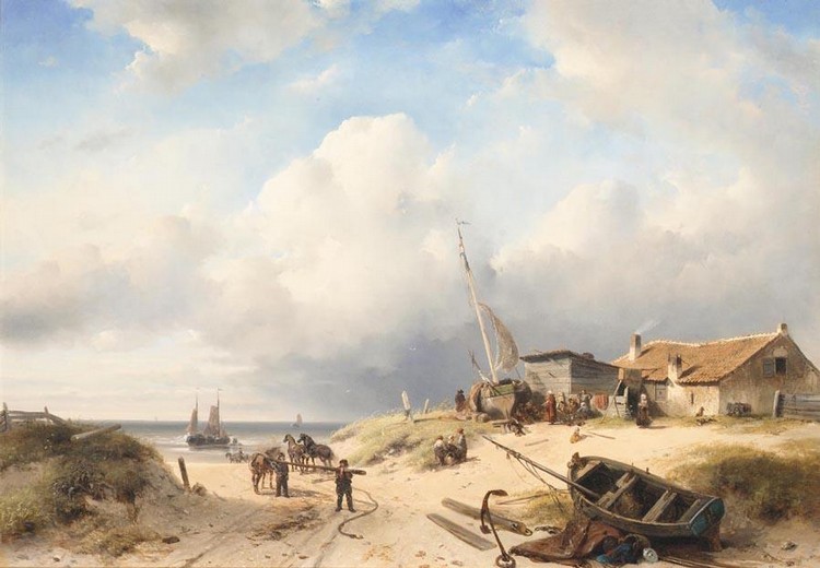Leickerts was een leerling van Andreas Schelfhout (1787-1870), ook al een ‘Haagse Belg’. Schelfhout werkte wel vaker ook in de omgeving van Noordwijk, maar net zo goed in Scheveningen. Leickert zal dus welderis in Noordwijk zijn geweest, zijn meester volgend. Maar of dit schilderij in Noordwijk is gemaakt? Hoeveel het er ook op lijkt, het kan net zo goed Scheveningen of zelfs Katwijk zijn geweest.