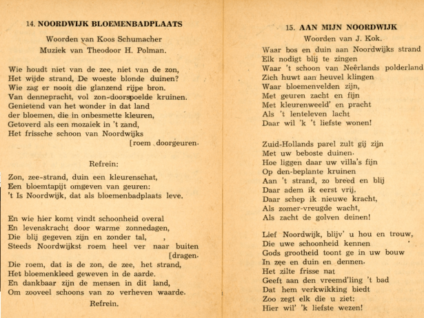 De Noordwijkers hadden er intussen een zangbundel aan overgehouden en moeten nog tot diep in de Jaren Vijftig uit volle borst quasi-harmonische klanken hebben uitgestoten. De twee Noordwijkse liederen die in de bundel waren opgenomen, kende ik nog niet. “Noordwijk Bloemenbadplaats” was gedicht door ene Koos Schumacher en getoonzet door Theodoor Polman. Het lied stamde nog van de Bloemenfeesten van 1939, toen het in Huis ter Duin zijn première mocht beleven. Het andere lied “Aan mijn Noordwijk” was van de hand van de oude Meester Kok (en eveneens door polman getoonzet). Het schijnt in sommige kringen nog steeds te gelden als ‘volkslied van Noordwijk’, getuige een uitvoering ervan door het toenmalige college van B&W in 2012: